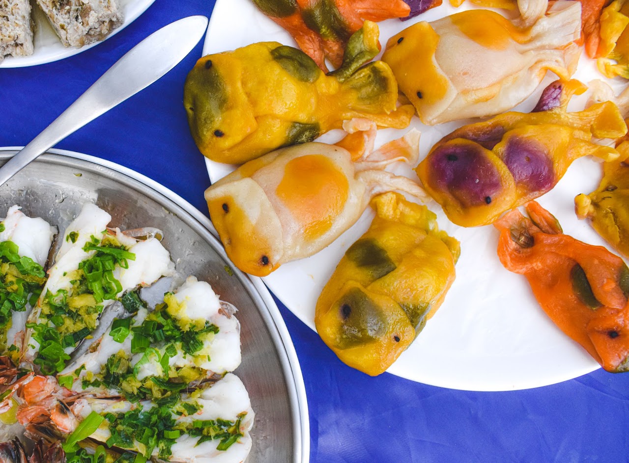 This picture shows a home cooked meal my grandmother made for a family meal. The primary subject of this photo are the plates of shrimp and fish-shaped dumplings that are featured. Because this photo has been taken from a bird's-eye view, the background features a navy blue tablecloth. In this picture, both my grandmother's passion for cooking and the care and dedication she put into creating this meal for my sisters and I represents love. Food is her love language, as well as the means she uses to express herself. It is clear that my grandmother put a lot of time and effort into this celebratory meal. Wrapping dumplings, especially the special ones pictured in this photograph, is not an easy task. In this photograph, it is the food itself that matters the most, not fancy, matching platters and utensils. The attention to detail in each of the fish-shaped dumplings shows the depth of care in our relationship with our grandmother, and the fish themselves also serves as a symbol that represents my sisters and I. Just like these multicolored fish, my sisters and I are a unique blend of different identities that make us who we are. No matter where we go, we will always cherish our cultural roots.