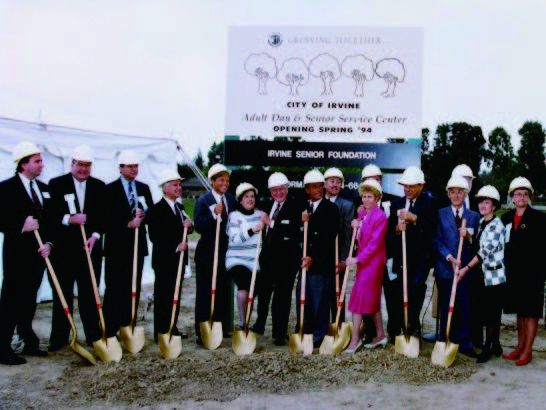 爾灣松柏會捐款十萬元贊助市府興建老人中心,1994 年由范仲及汪亞英代表參與 Lakeview Senior Center 破土儀式