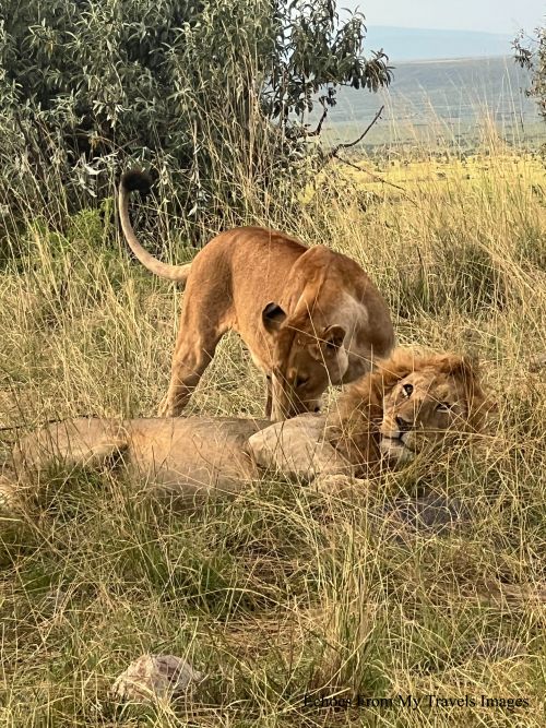 我們的車子接著慢慢往山丘爬,我記得「獅子王」電影,獅王站在一岩石上俯瞰領地的雄姿,鮑伯說,他帶我們來這附近找尋獅群的縱跡。「哇,這附近的景色不是和電影獅子王的場景很像嗎?」我這樣問道。車子迂迴在山徑小道,居然看到獅群,還有被啃食過的班馬屍體,幾隻母獅和3隻小獅,在樹叢裡翻滾,飽食後的獅子看到車子逼近,無動於衷,離獅群幾10呎遠還有一雄狮,懶洋洋提不起勁樣子,獨自趴在石堆上休息,沒有獅王的架勢。獅群裡只有小獅們互相追逐,地上翻滾,那副頑皮樣,深得討喜。獅群的日子是如此悠閒嗎?其實不然,母獅要找尋獵物,雄獅則保護領地,不受其它獅子和動物的侵犯。獅群為了生存,必須活的堅強和驕傲。故英文用驕傲(pride)這個字來代表獅群。