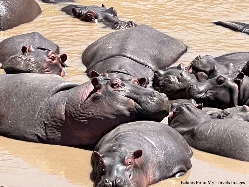來到河邊,我們終於看到河馬了,先是7、8隻河馬,轉個彎又有20-30隻從水裡浮出,成群的河馬在戲水消暑。我們急著推開車門,想抓拍河馬張開血盆大嘴互鬥鏡頭。鮑伯大聲喝止,他先下車四周巡視,確認沒有野生動物的威脅,才讓我們離車,這是獵游的首要規矩。我們要觀賞的河馬是比非洲五霸更危險的動物,每年傷害人的數字居冠。鮑伯的警覺是有道理。我對河馬的印象,總覺得它的外型溫順舉止慵懶,那想得到它跑的快,和五霸動物互鬥,堪稱無冕之王,可謂真人不露相。