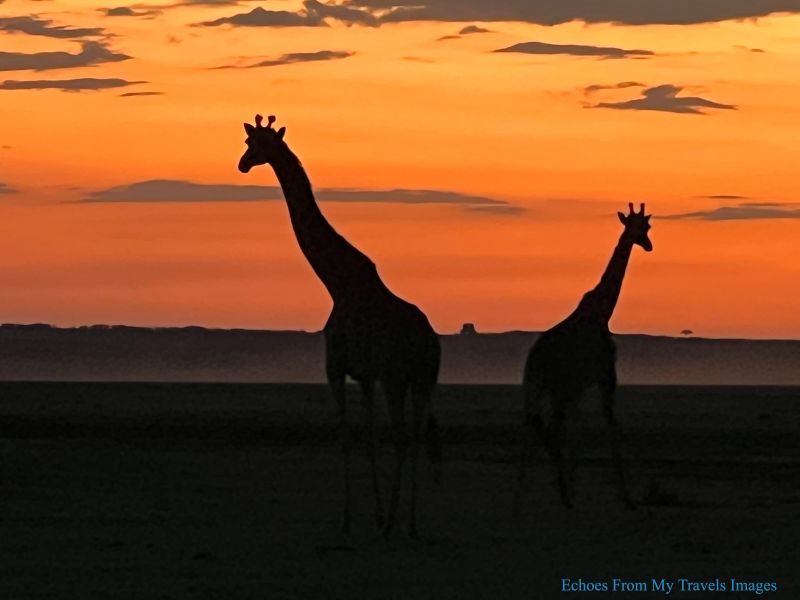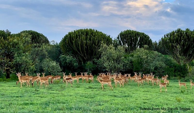 離開湖岸,我們的吉普車,開始奔馳穿梭在草原和叢林中,車子顛簸當地人稱之「非洲按摩」一點也不為過,有時車子還竄入已快被密布樹林掩沒的小徑,讓人體會到獵游的狂野魅力。此刻天近黃昏,動物紛紛出來覓食,成群長頸鹿圍著非洲相思刺樹( Acacia),採食嫩葉。斑馬三五成群低頭吃草。還有猴群,水牛,和羚羊逐一登場,金黃的暮色撒在草原上,恍似伊甸園。大草原地平線上的非洲相思刺樹, 就像一座座巨大的太陽傘,電影「獅子王」的群獅王國的畫面,立刻湧現在我的腦海,火紅的夕陽掛在樹梢,幾隻斑馬在樹陰下吃草,暗紅的無垠草原,正在夕陽西沈之際,慢慢換裝成橘色,到最後成淡墨,我沉醉其中,大自然真是奇妙!想想這一幕美景在時間長河,重複了幾千萬年,但從自然美景中,我們的文明歷史學習了多少?我不知道,人類永遠是一個過客。達爾文說:只有服從大自然,才能戰勝大自然。