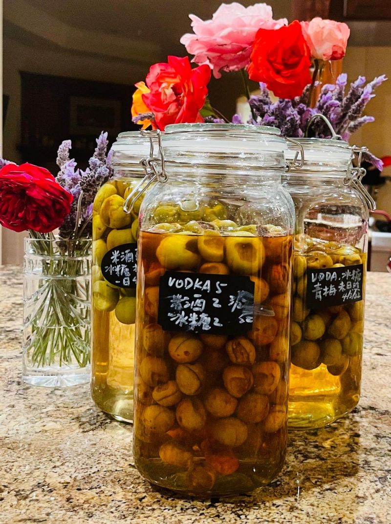 我們的餐桌上也常常放上小小一樽自家釀造的梅酒,先放梅子和冰糖,有的是加入伏特加,有的是加入威士忌,或者米酒、清酒,也可混合。酒量不大,淺酌而已。宋詞人説,”重來一夢,手搓梅子,煮酒初嘗”。梅呈現出醇厚的酒香,青梅配煮酒,一盞醉千秋。曹操和劉備 “青梅煮酒論英雄” ,我們青梅煮酒論家事、國事、天下事,更多的時候是”把酒話桑麻”,看雲舒雲卷,過平常歲月。