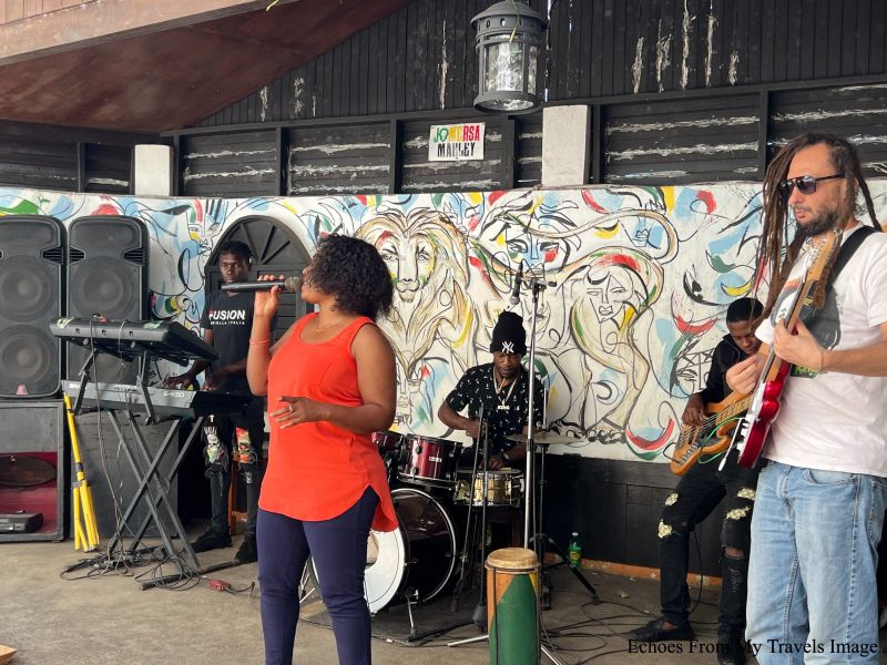 在宅院裡,有一樂團現場演奏雷鬼音樂,讓樂迷們感受鮑勃馬利的音樂魅力。雷鬼音樂是牙買加城市街頭,一些社會底層人士以獨特的音樂節奏和風格表達對新聞、社會八卦和時事評論的看法。鮑勃馬利獨特嗓音和歌曲演譯,深深打動人心,成為雷鬼音樂教父級的靈魂人物。他的音樂創作,和當地客家華人有密切關係。他的第一首歌曲「One Cup of Coffee」(一杯咖啡) 就是華人Leisli Kong 成立的比華利(Beverley)唱片公司幫他錄制的,開啟他的演唱生涯。Leisil Kong 也是雷鬼音樂的歌手,從開冰淇淋店和唱片行起家,到成立唱片公司,一些知名的歌手,都得到他的協助,包括鮑勃馬利在內。
