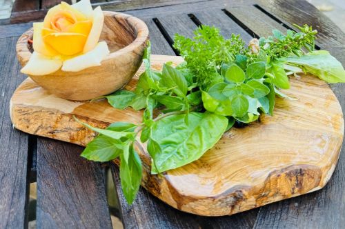 基本款的田園沙拉常用的蔬菜,像羅馬生菜、芝麻葉、西芹、菠菜葉、菊苣、甜菜、胡蘿蔔、小玉米等,到市場購買。番茄、小黃瓜、紅白洋蔥、黃紅甜椒、櫻桃小蘿蔔、辣椒、栗子南瓜等,根據時節,長在菜園。製作沙拉醬汁的食材,檸檬、萊姆,走到柑橘小徑,隨手摘取;橄欖果實,生產量大,還沒有計劃榨橄欖油;酪梨常用,酪梨樹却長得緩慢,還未結果。點綴在沙拉上的水果,蘋果、石榴、百香果、桑葚、金橘、梅子等,大多來自家園。不論是田園沙拉、凱撒沙拉、主㕑沙拉、水果沙拉,有的清脆多汁,有的口感溫和,有的微苦,有的辛辣,有的甘甜。擺盤後,抓一些香草陪襯,當時長什麼,就放什麼,只要不搶蓋過主角就行了。