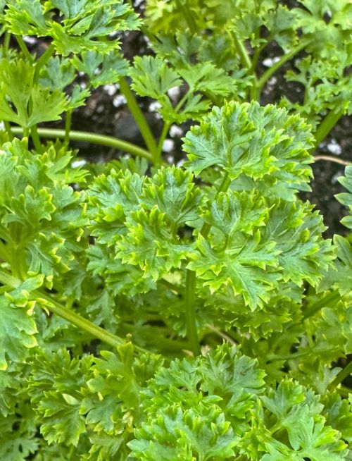 歐芹別稱巴西利、洋芫荽,是二年生草本植物,原產地是地中海沿岸。希臘語裡,它是長在石縫和牆上的芹菜,至少有兩千年的栽種歷史。清新柔和,當擺盤裝飾,黑胡椒、白蒜片,緑歐芹,紅番茄,光看就暑氣盡消。直接當作生菜使用,翠緑葉片和細細的白根都不浪費。撒在魚湯裡,嫩葉在清湯裡攪拌一下,浮浮沈沈,別具風味。和馬鈴薯一起烤,滋味更香郁。乾燥壓碎了裝瓶,摻和在義大利麵裡,那種美味再也難以割捨。它富含維生素A,K,B,C 鈣和鐵。莎翁劇本裡寫道,“去花園摘一些歐芹,塞在兔的肚子裡…”。這道菜我還沒有試過。