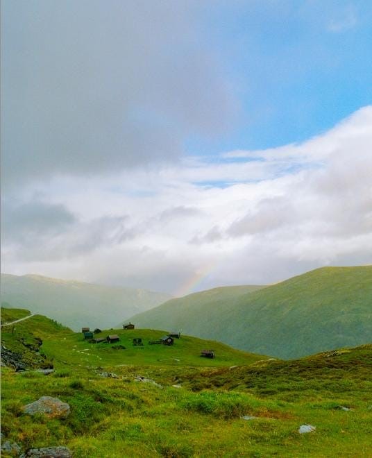 這一路上有天然美景陪伴,巍峩巒嶂的高山峻嶺,大大小小的雪白瀑布、清澈碧綠的深沈峽灣,迷人奇觀盡收眼底。有時彷彿穿過灰濛靉靆的雲霧,有時經過幾間紅褐色、玩具般的小巧木屋,忽然在路邊山頭看到用花崗岩堆砌著一位眺望遠方的旅人。再轉一個彎,一道彩虹豁然出現在群峰之間,趕緊將車停在路邊,追逐瞬間即逝的長虹。低溫加上風雨,風寒效應,讓八月夏日感覺好似零下寒冬,又趕緊上車。