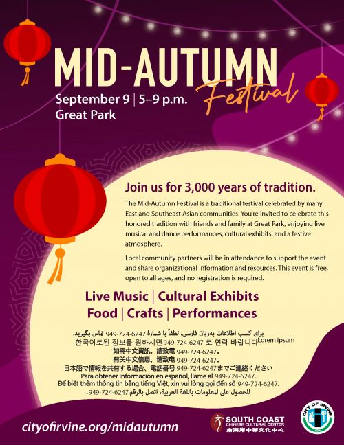 歡迎民衆與朋友和家人一起穿戴族裔傳統服飾或配件,來參加爾灣市和南海岸中華文化中心在The Great Park 大公園舉行的中秋節慶,享受現場音樂和舞蹈表演、文化展覽和節日氣氛。今年中秋節落在九月十日星期六,但是爾灣市今年在前一天亦即星期五傍晚舉行慶祝活動,以便所有各文化社群可以在這一天一起慶祝。