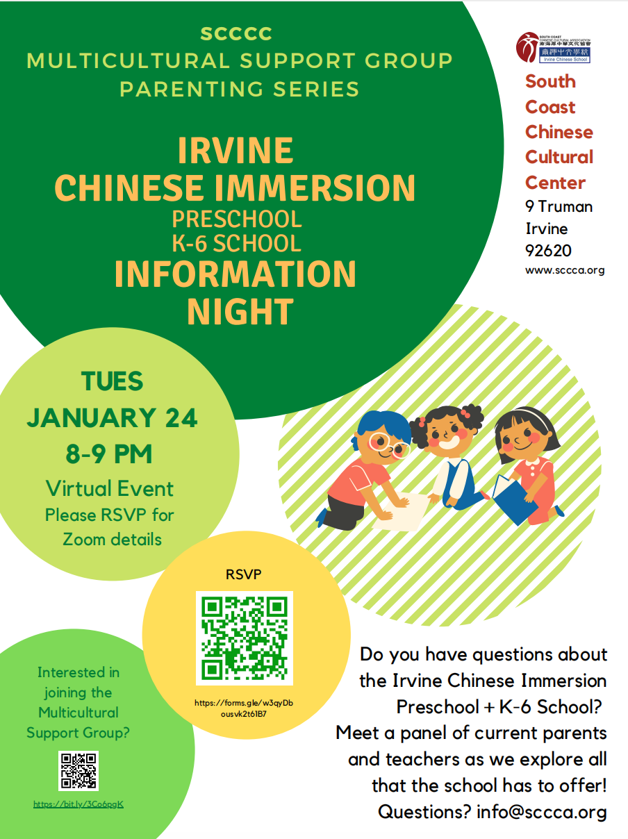 The January Seminar Series of the Multicultural Support Group has started! If you are interested in our Chinese immersion preschool, K-6 school, Afterschool program, weekend Chinese School, Summer Camp and Adult Chinese Program and want to get more information, please lock in the 8-9 p.m. on January 24th and January 26th. Let's meet at the Zoom conference.