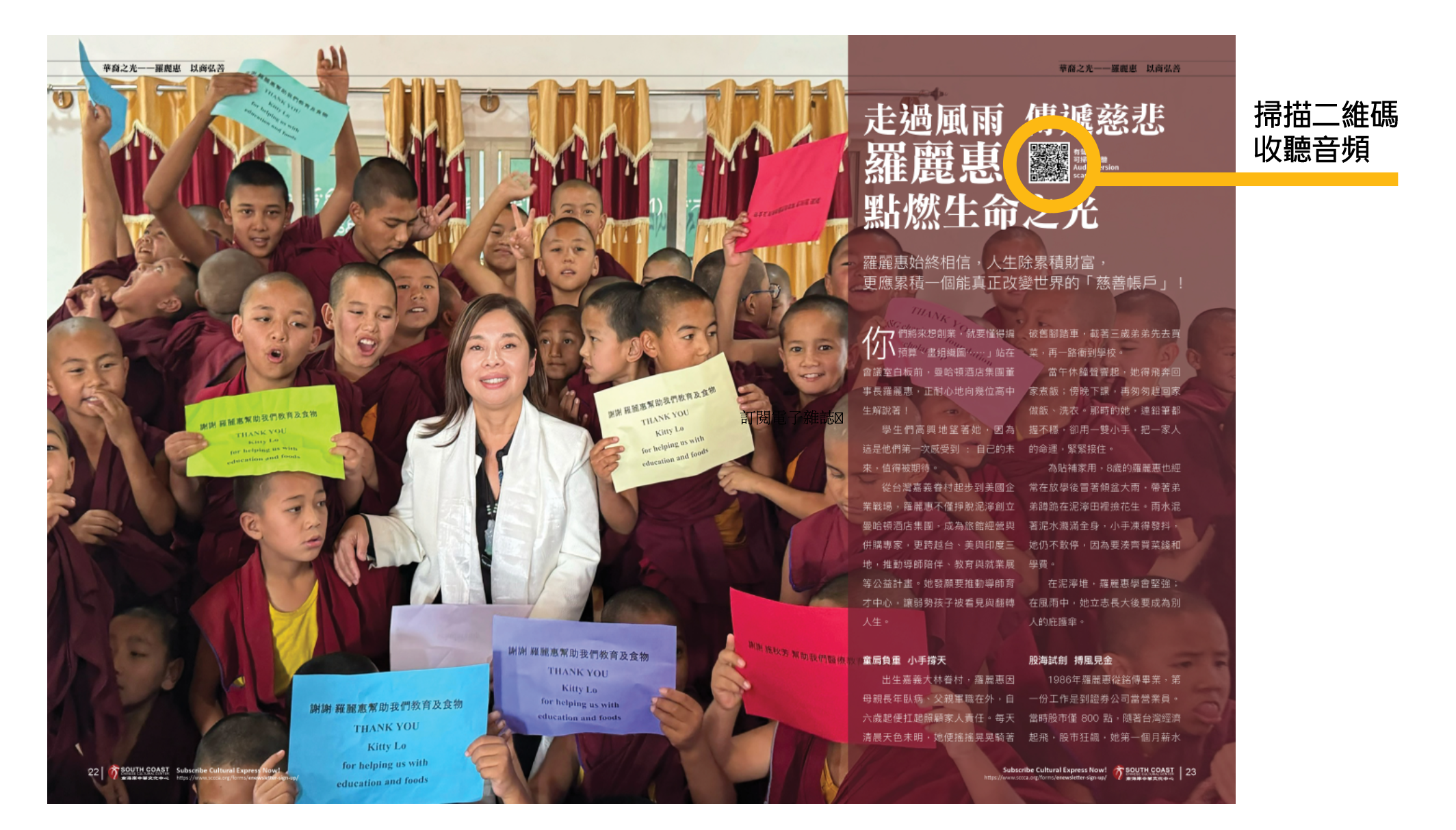 《華裔之光》雜誌以紙本、電子版與音頻等多媒體方式,同步對外發行。無論紙本或電子版,只要掃描或點擊受訪者標題旁的「QR Code / 紅色音符」,即可聆聽朗讀音頻,讓閱讀跨越文字,走進聲音與情感。