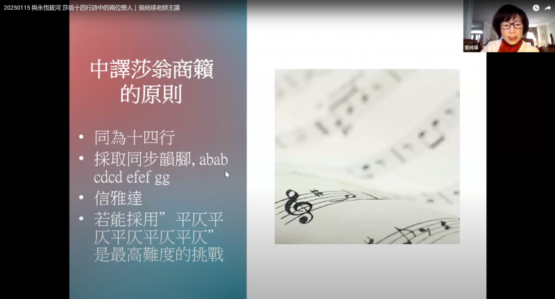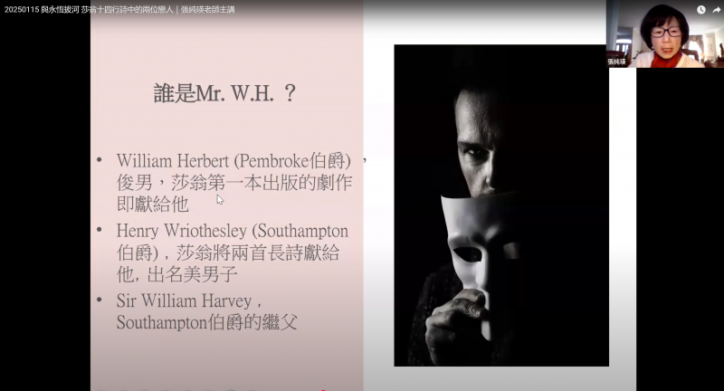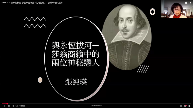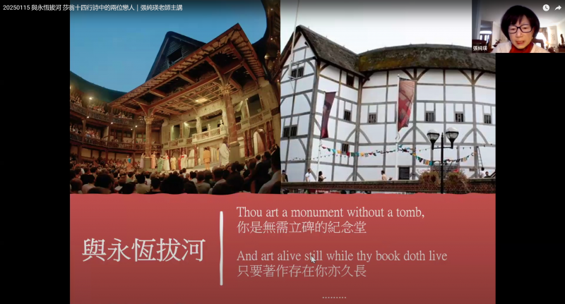 這種多媒體演講表達方式,除讓整場講座變得更具沉浸感,也使線上聽眾在聲音與文字的交織中,更深刻領悟到莎士比亞作品中深邃的情感世界。