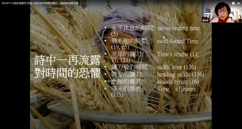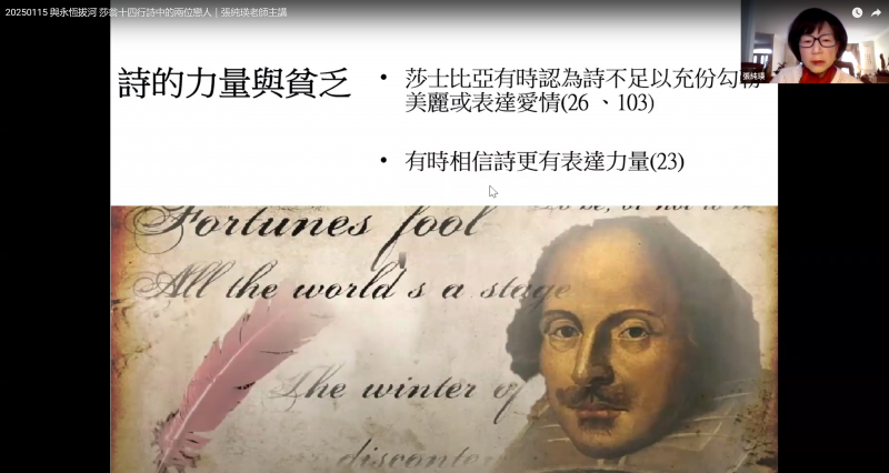 張純瑛除進一步解析莎士比亞如何通過詩歌對抗時間的無情,並強調詩歌作為一種文學形式,在面對死亡與衰老的威脅時,能賦予短暫生命以永恆的意義。
