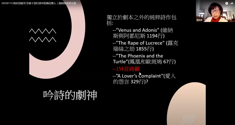 在演講中,張純瑛特別聚焦在莎士比亞十四行詩中的兩位神秘戀人,她透過莎翁在詩歌中的描寫,探討了愛與死亡、詩與永恆間的緊密聯繫。
