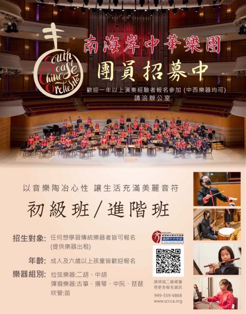 The South Coast Chinese Orchestra, which performed the entire piece of "Monkey King," is currently enrolling students for its spring session. Beginners or advanced students of the dizi, erhu, guzheng, zhongruan, or pipa are welcome to join. Please scan the QR code on the poster or use the registration link.