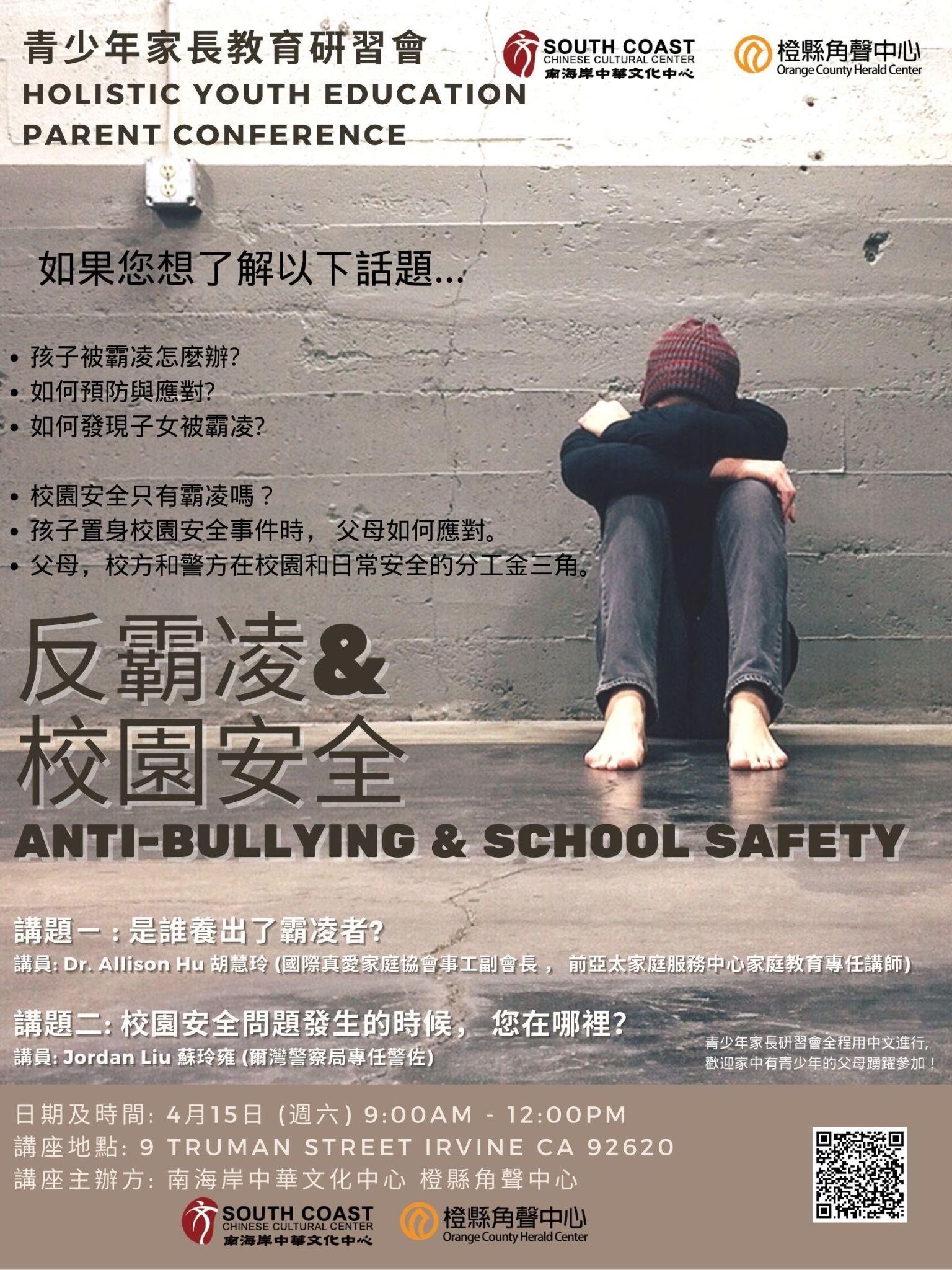 鑑於近期內發生數起的校園槍擊, 亞裔仇恨, 族裔衝突升高等令人憂心的社會現象, 橙縣角聲中心和南海岸中華文化中心攜手合作,化被動為主動, 聯手出擊, 邀請您參加護衛心理健康及人身安全的研習會。 a. 是誰養出了霸凌者? (胡慧玲博士) b. 校園安全問題發生的時候,您在哪裡? (蘇玲雍 爾灣警局專任警佐)