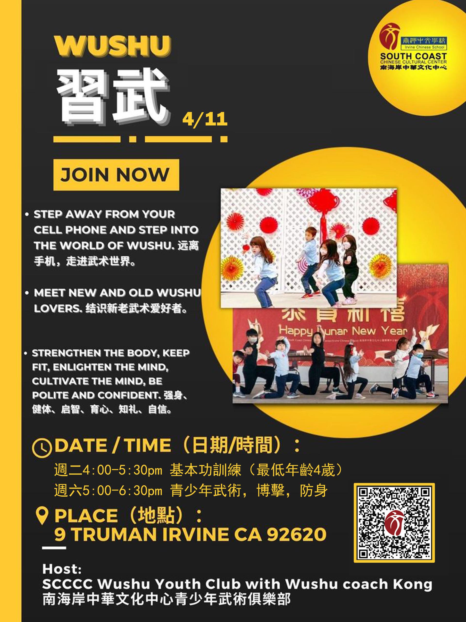 | WUSHU 習武 If you want your children to stay away from mobile phones, strengthen their bodies, cultivate their intelligence, cultivate their hearts, be courteous, and be confident, and enter the martial arts world. Don't miss it! There is a great opportunity to experience martial arts for free. Please register ASAP. 想要孩子遠離手機,强身、健體、啟智、育心、知禮、自信,走進武術世界。 別錯過! 免費體驗武術的大好機會,報名請早。 |