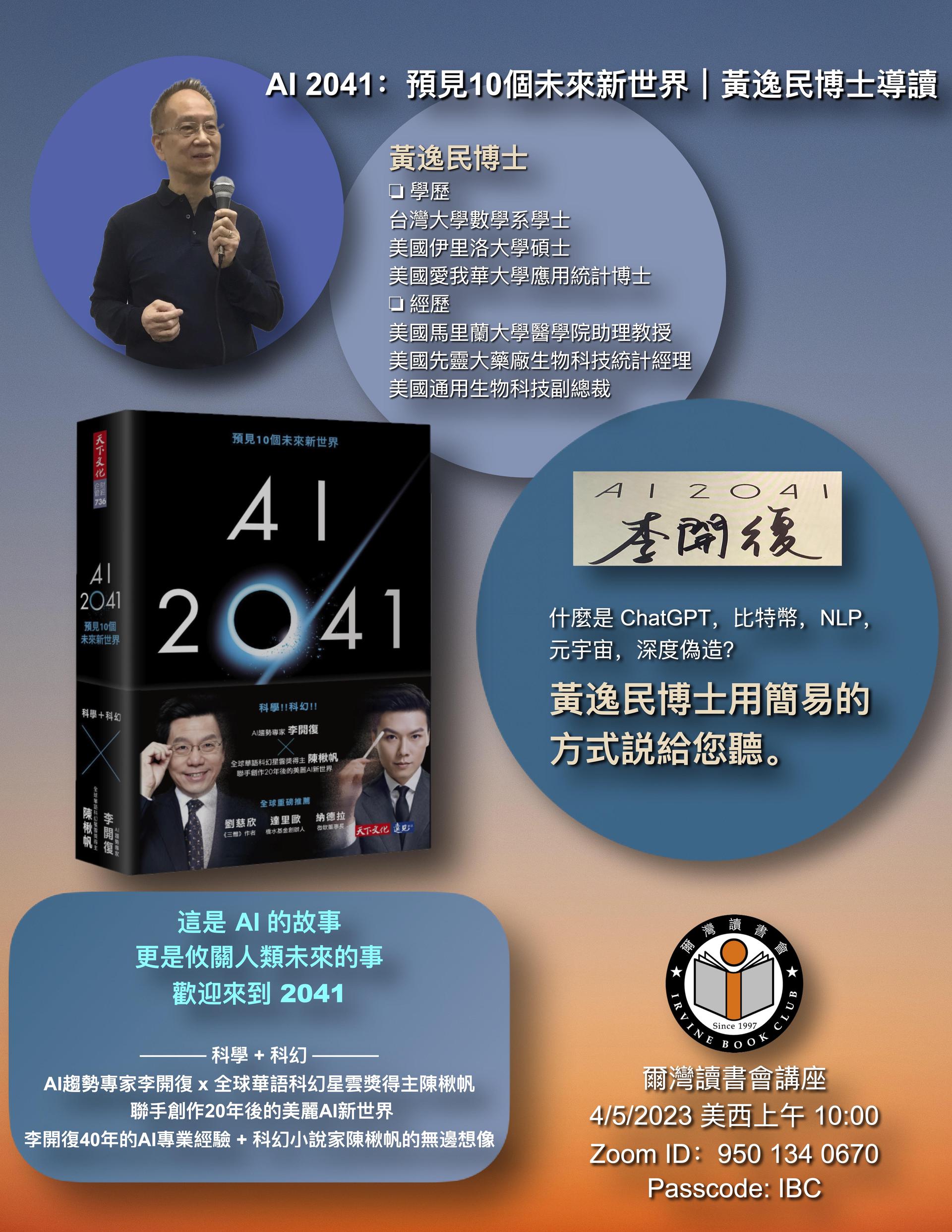 Al 趨勢專家李開復x全球華語科幻星雲獎得主陳楸帆的無邊想像,聯手創作20年後的美麗Al新世界。 爾灣讀書會講座 4/5/2023 美西上午 10:00 Zoom ID: 950 134 0670