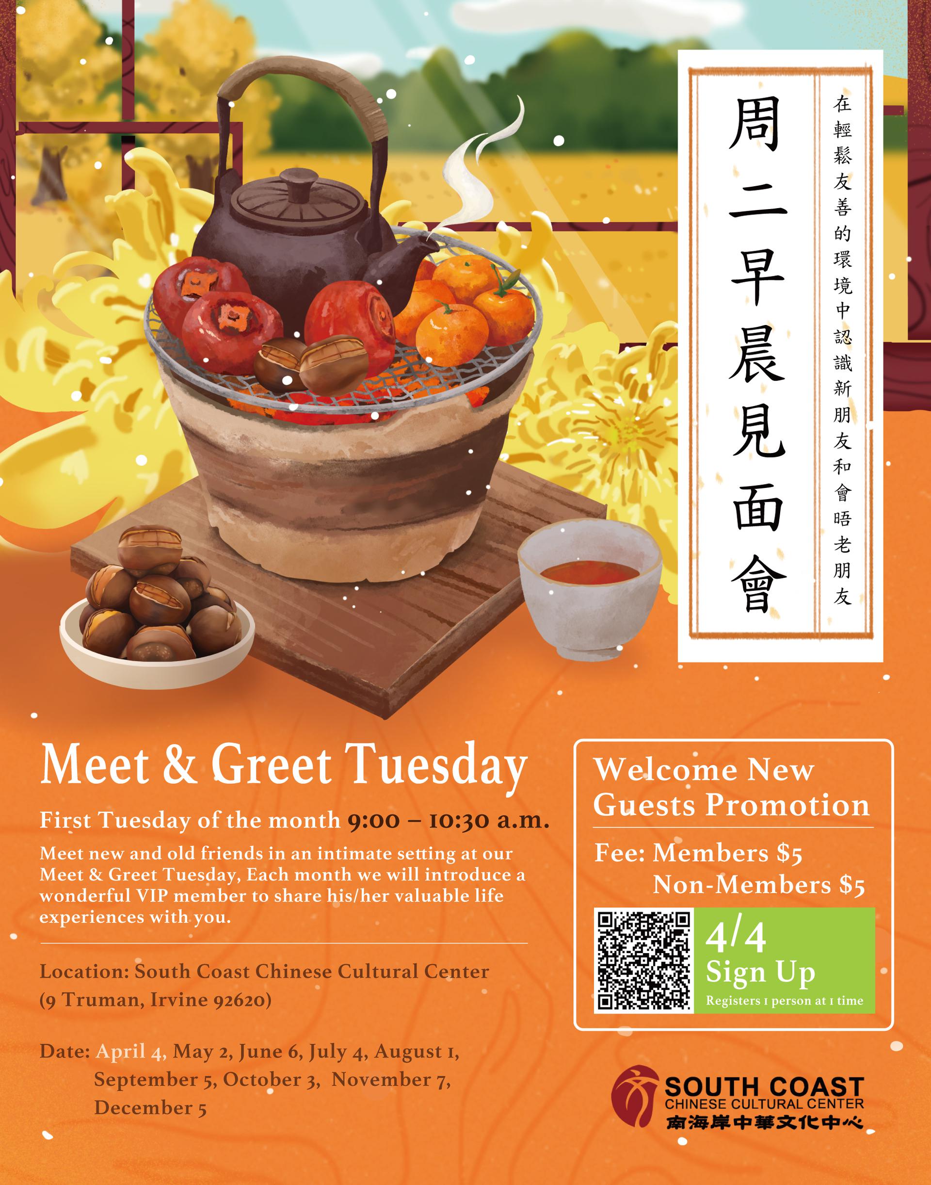 | Meet & Greet Tuesday 週二早晨見面會 At 9:00 am on April 4th, the 《Meet & Greet Tuesday》 is here again! Let's have tea together, chat with old friends, and welcome new friends!