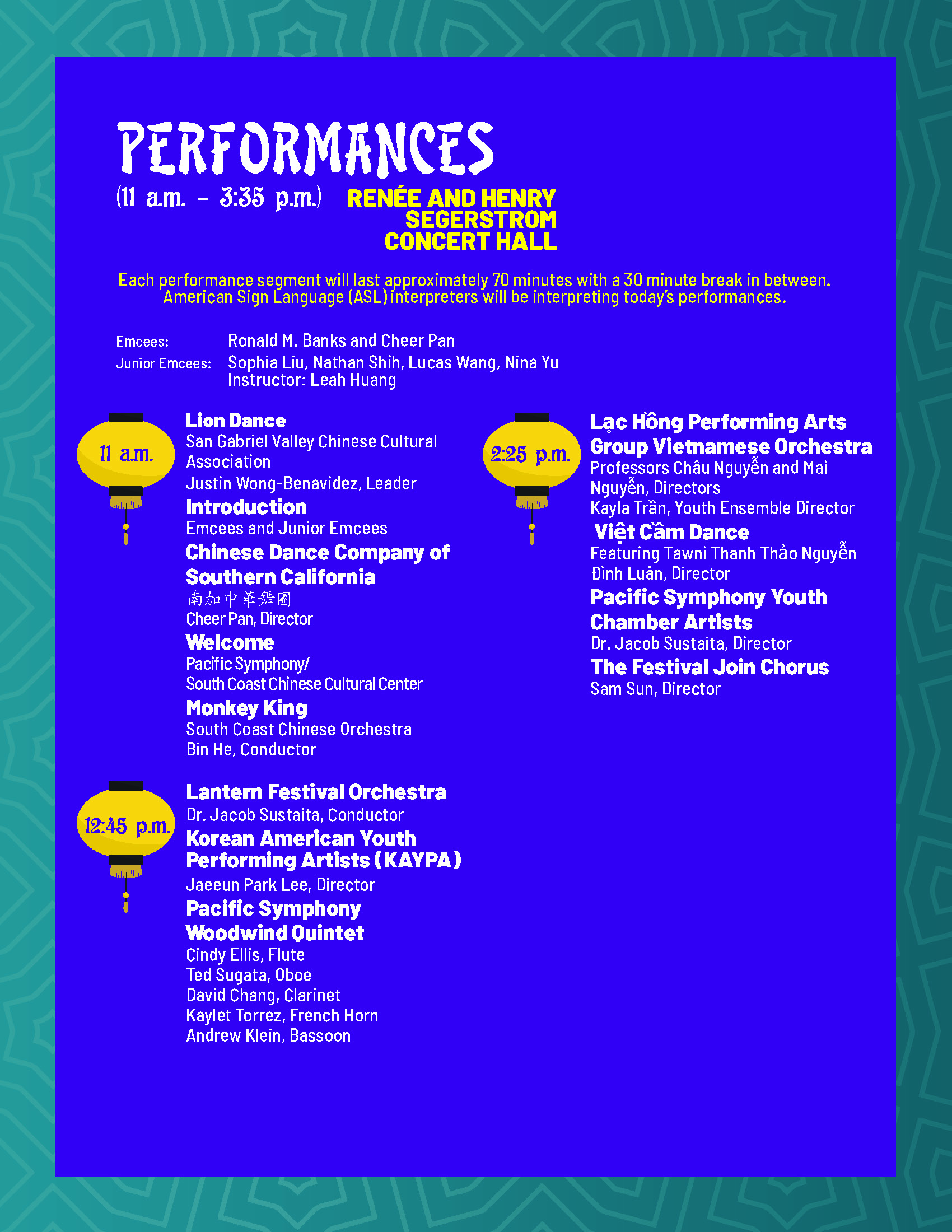 太平洋交響樂團與南海岸中華文化中心合辦的橙縣元宵燈會,訂於2023年2月18日在Renee & Henry Segerstrom Concert Hall舉行, 現場還安排多元文化展演及體驗活動,讓我們先來看看橙縣元宵燈會的節目單。 |