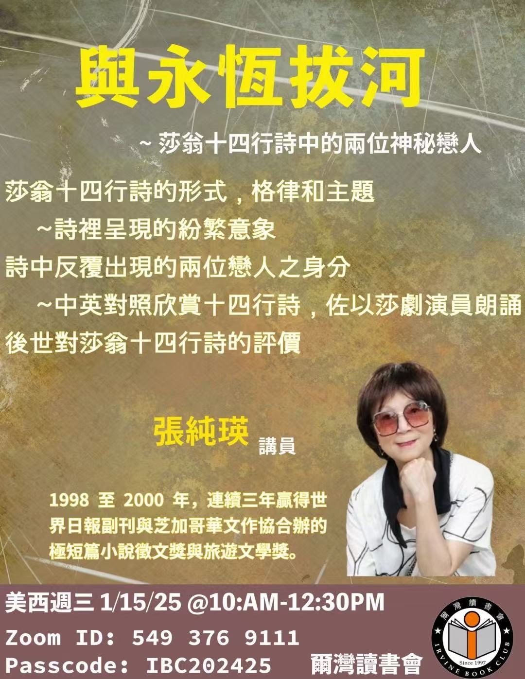 On January 15th, acclaimed overseas Chinese author Cynthia Tang delivered a lecture titled Tugging with Eternity: The Two Mysterious Lovers in Shakespeare’s Sonnets, exploring the interplay of love and time in Shakespeare’s works through literary, emotional, and philosophical lenses... 知名海外華文女作家張純瑛1/15日在一場主題為《與永恆拔河:莎翁十四行詩中的兩位神秘戀人》演講中,除分別從文學、情感和哲學等角度,探討莎翁在商韻中所描繪愛情與時間的對應關係,也播放莎劇演員朗誦十四行詩片段,讓聽眾親自體驗商韻的優美,多媒體演講模式,引起熱烈迴響... |