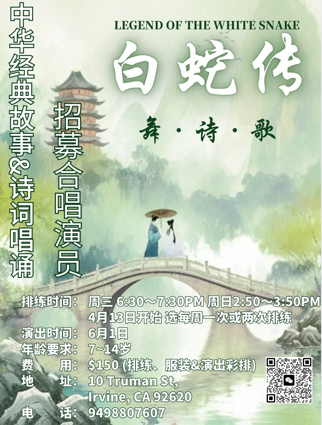 中華經典故事·中華經典古詩唱誦開始報名! 排練時間:週三 6:30-7:30pm;週日2:50-3:50pm 演出時間:6月1日 費用:150(排練/服裝 &演出彩排) 地址:10 Truman St, Irvine, CA 92629 電話:9498807607