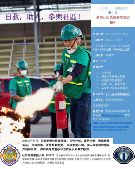 爾灣警察局與橙縣消防總局合作,推出全美唯一的全中文社區急難應變培訓,培訓内容包括:災難應變的醫療訓練、火勢控制、傷勢控制、傷患營救運送、災難搜索、恐怖襲擊應變、災難應變心理、個人與家庭的備災知識和習慣。 課程由專業警察和消防員以全中文授課... |