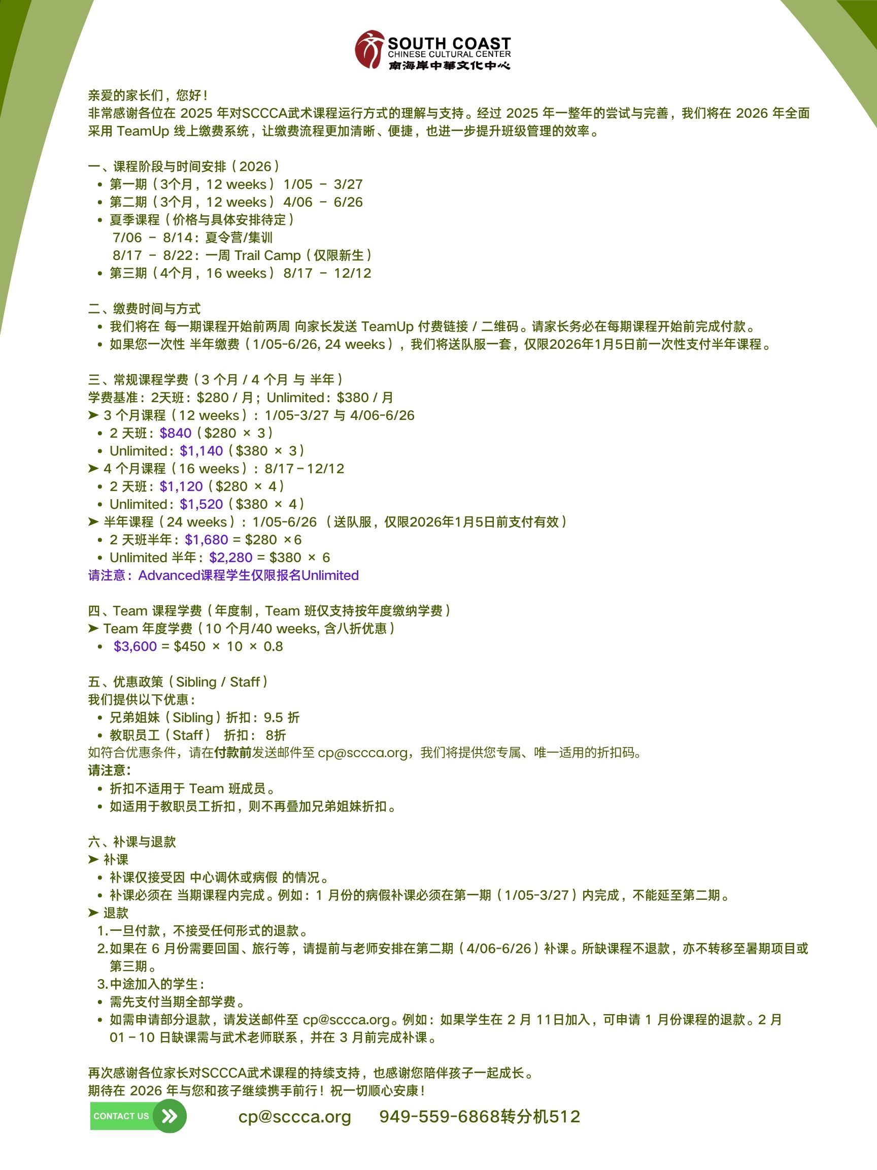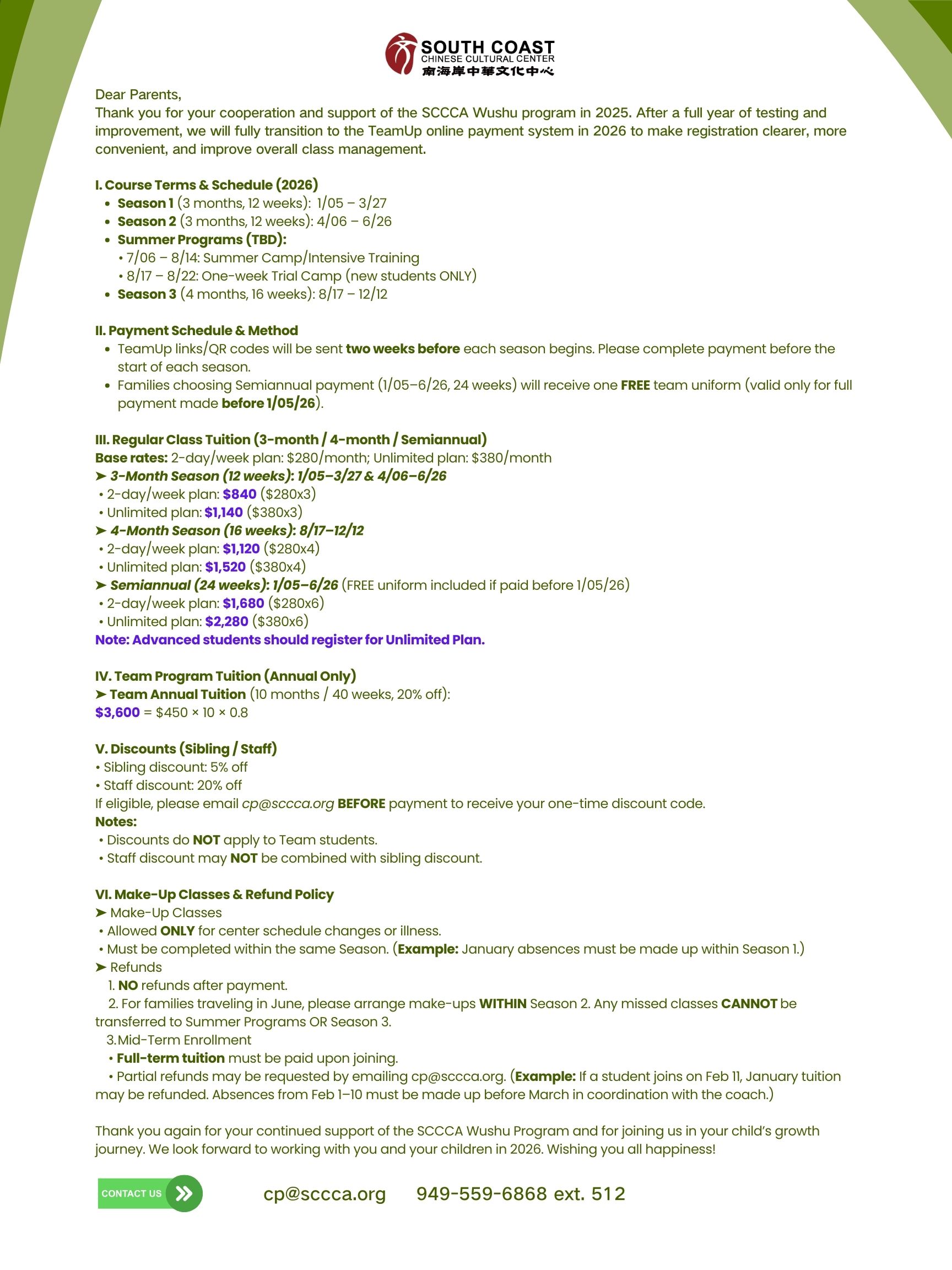 Practicing Wushu helps children build strength, improve coordination, and develop focus, discipline, and confidence. Our program is led by a team of master's graduates from Beijing Sport University, supported by the South Coast Wushu Team, and conducted in a professional training facility with top-tier resources. The curriculum includes foundational skills, technique training, and practical application, unlocking each child's potential while fostering resilience. Training in such a structured and culturally rich environment not only enhances physical fitness but also instills perseverance and a deep appreciation for traditional martial arts. We also welcome adult students to join our program.