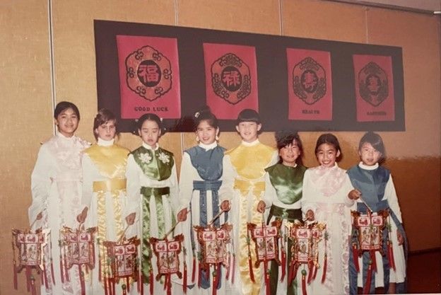 1977年爾灣中文學校慶祝農曆新年的「中國之夜」,宮燈舞表演服裝全部由家長製作。