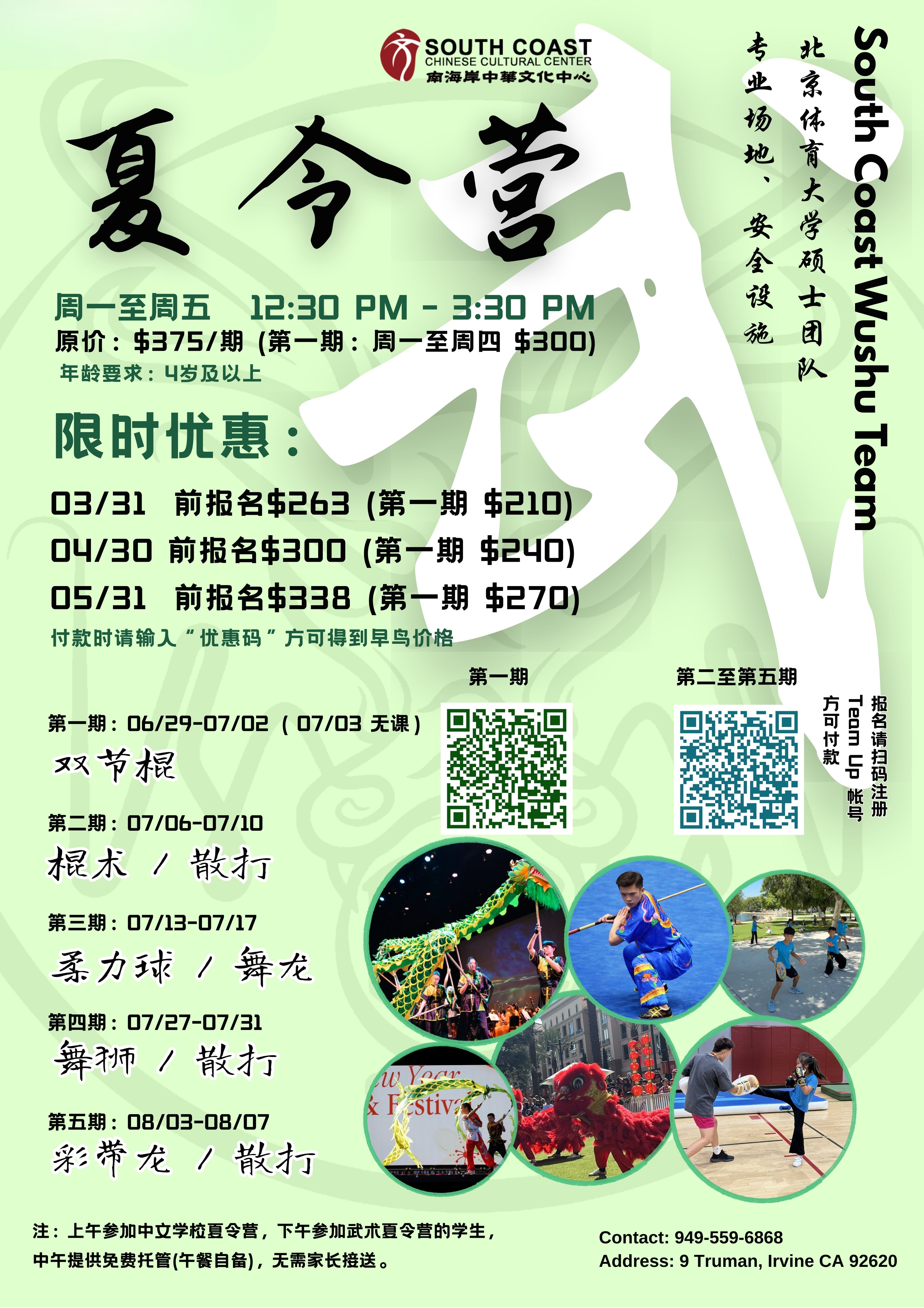 學生在武術夏令營報名並付款時,可享有以下每期的早鳥優惠價格。