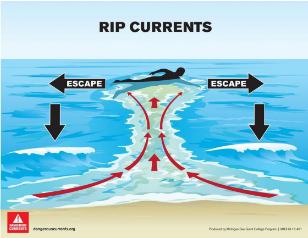 Rip currents are powerful currents of water moving away from the shore. They can sweep even the strongest swimmers out to sea.