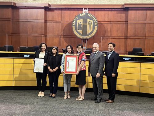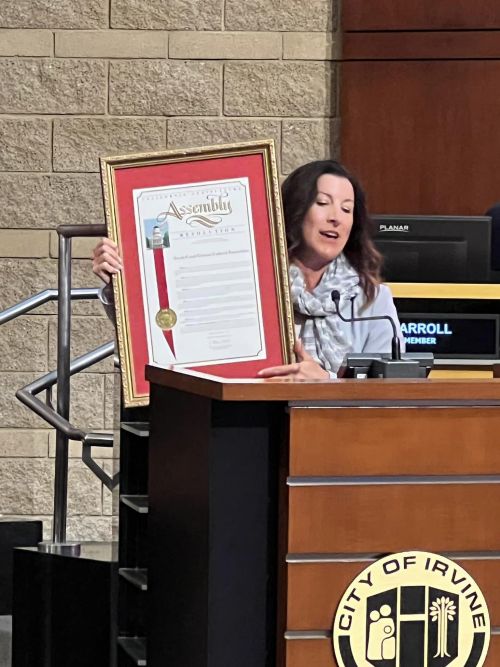 加州第74選區衆議員Cottie Petrie-Norris 於 2022 年9月13日在爾灣市議會上,頒贈一項表揚決議,肯定南海岸中華文化中心的長期貢獻,文化中心執行長鍾幼蘭代表接受了這份表揚狀。