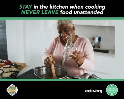 - 烹煮食物時應留在廚房裡,沒人照看的爐火是導致火災的主要原因。