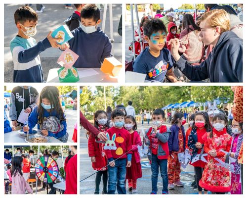 爾灣中文學校師生及家長,21日及22日兩天在校園中歡慶農曆新年。各班學生由老師帶領,在戶外園遊會的攤位上,動手製作兔年吉祥頭飾,比賽筷子夾紅豆技術,並展開吉祥話組詞大比拼。