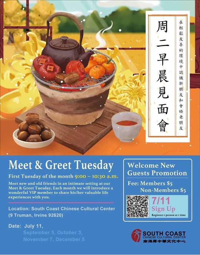 Meet & Greet will continue on July 11, September 5, October 3, November 7 & December 5 at South Coast Chinese Cultural Center (9 Truman, Irvine). Please scan the QR code to register.
