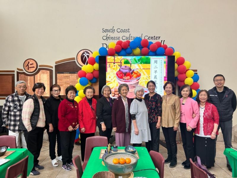 The Tuesday morning meetup in June was moved to the lobby of the South Coast Chinese Cultural Center. Several members of the Irvine Evergreen Choir were invited to lead the audience in singing a couple of Chinese songs. Some of the guests also took turns sharing Mandarin and English songs as well as recitations. The timeless classics had us all feeling like one big happy family.
