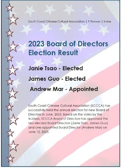 South Coast Chinese Cultural Association (SCCCA) has successfully held the annual election for new Board of Directors in June, 2023. Based on the votes by the trustees, SCCCA Board of Directors has approved the two elected Board Directors (Janie Tsao, James Guo) and one appointed Board Director (Andrew Mar) on June 12, 2023.