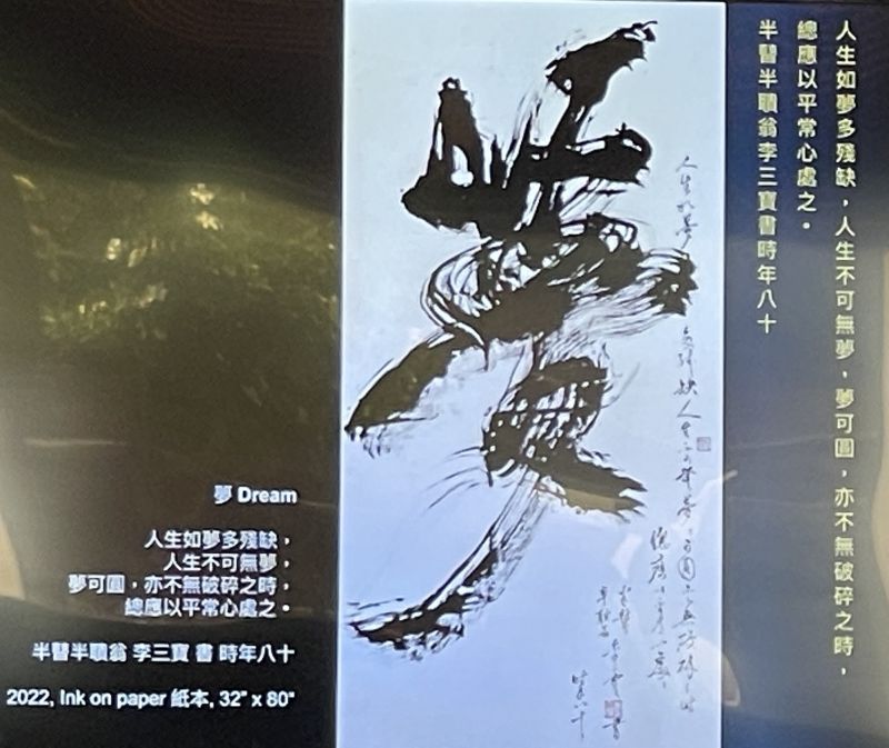 去年慶祝80 歲生日時,李三寶教授寫下一幅以夢為主題的作品:「人生如夢多殘缺,人生不可無夢,夢可圓,亦不無破碎之時,總應以平常心處之。」沒想到家裡的貓在玩耍時抓破了宣紙,渲染了未乾的墨汁,李三寶本想丟棄殘破的作品,轉念之間,將意外的效果留下來,裝裱後反而更能體現以平常心接納人生的領悟。