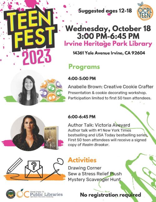 OC Public Libraries is pleased to present TeenFest 2023. This year’s annual event celebrating teens will be hosted on Wednesday, October 18 from 3:00 p.m. - 6:45 p.m. at Irvine Heritage Park Library. Teens ages 12-18 can enjoy free activities and workshops. The event will conclude with a keynote from New York Times Bestselling author, Victoria Aveyard. Activities include sewing a stress-relief plush, mystery scavenger hunt, and drawing corner. No registration is required but early arrival is suggested.
