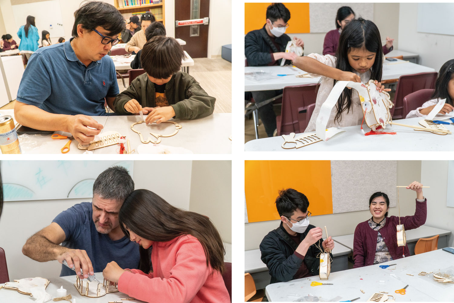 Subsequently, parents led their children, couples held hands, and even multi-generational families walked to the crafting tables to make lanterns. They picked up paper and scissors to begin their creations, creating a lively and heartwarming scene.