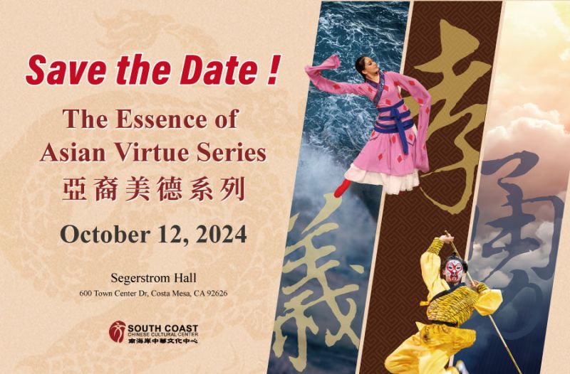 這三部傳統原創音樂劇全部屬於《亞裔美德系列》。其創作的原動力來自於相信亞裔文化是美國多元社會中非常重要且不可或缺的一份子,亞裔美德更是亞裔文化的核心。南海岸中華文化中心深信,《亞裔美德系列》會在更廣泛的文化對話中發揮關鍵的作用,為促進文化理解做出貢獻。因此,我們邀請您在2024年10月12日,讓我們再次歡聚在Segerstrom Concert Hall,首演全新呈現三部原創作品,指揮家何彬親自作曲及指揮。你一定會不虛此行,體驗經典故事所承載的魅力與美德。