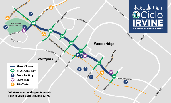 For questions on where to park or how to access your property during CicloIrvine, or concerns regarding the street closure, please email mail@carsla.net(link sends e-mail) and put "CicloIrvine" in the subject line. You may also call 213-355-8501.