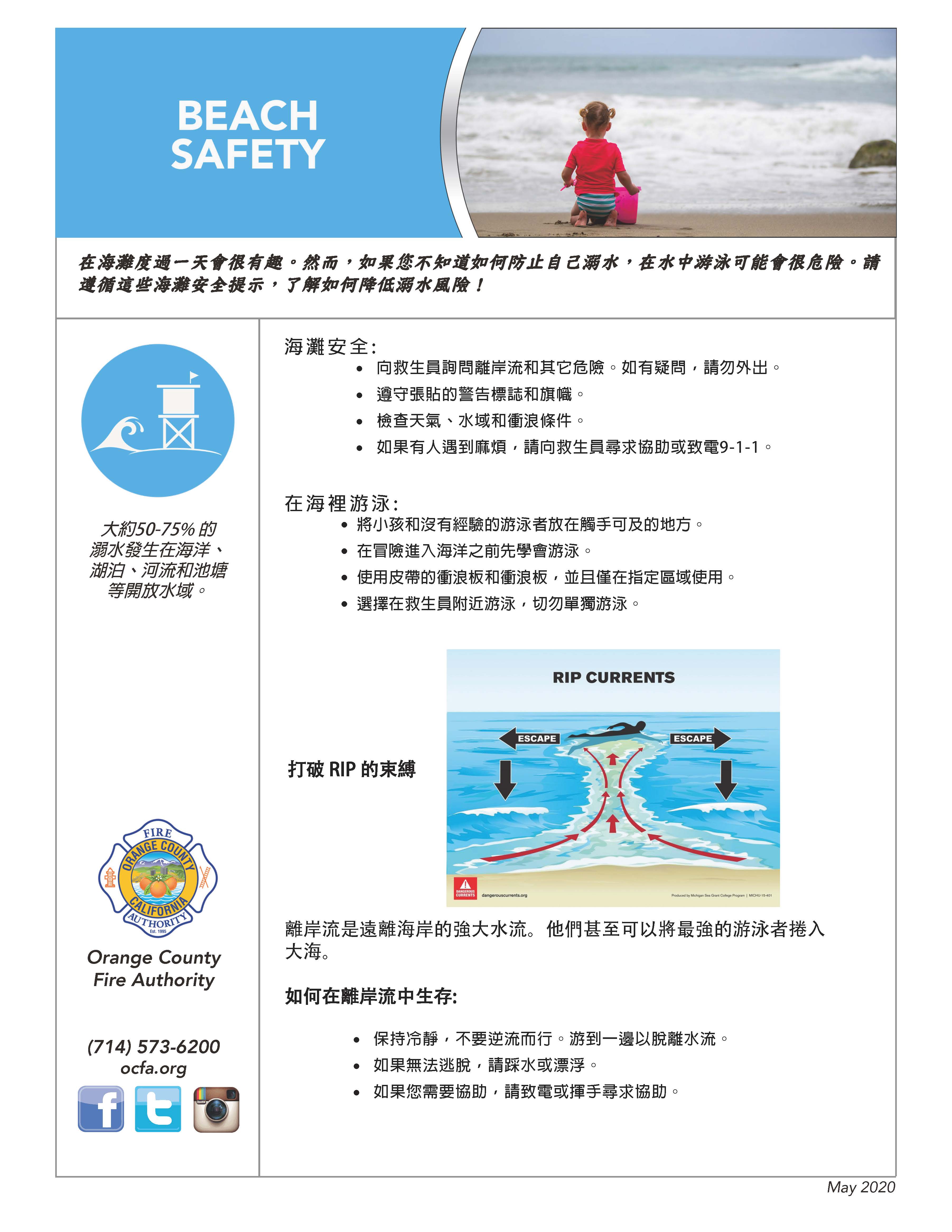 2023年,橙縣在海洋、湖泊、河流、池塘等開闊水域發生了30多起溺水事件。如果您不知道如何防止自己溺水,在水中游泳可能會很危險。請遵循我們的海灘安全傳單和社交媒體貼文中包含的安全提示,以了解如何降低溺水風險。