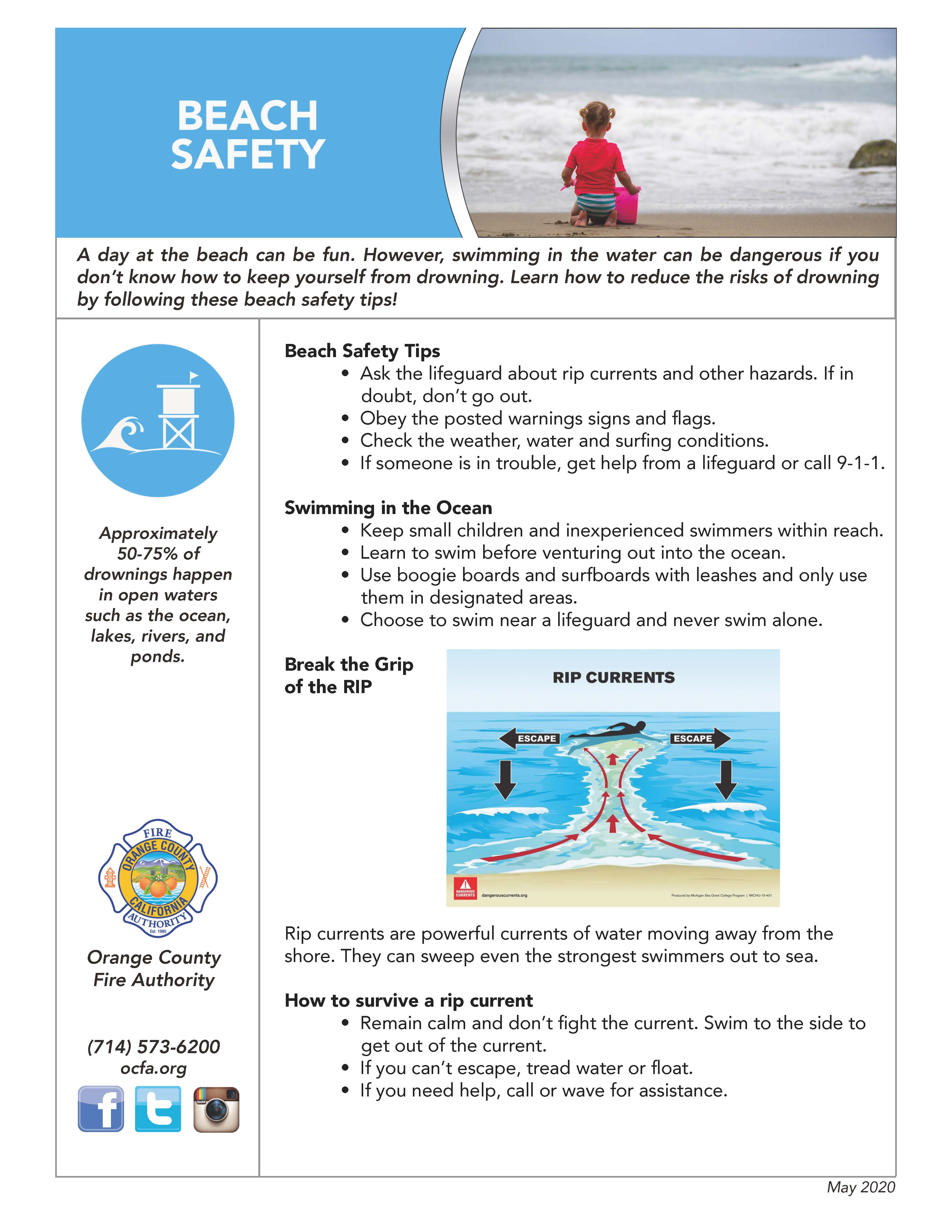 In 2023, over 30 drowning incidents in Orange County occurred in open waters such as the ocean, lakes, rivers, and ponds. Swimming in the water can be dangerous if you don't know how to keep yourself from drowning. Learn how to reduce the risks of drowning by following the safety tips included in our Beach Safety flyer and social media posts.