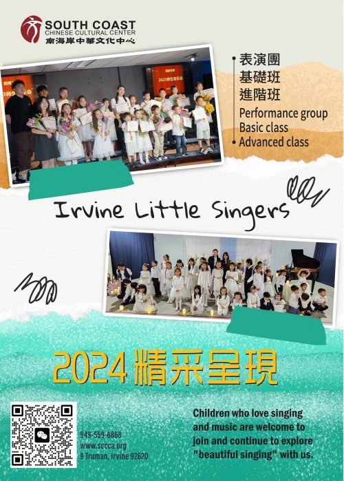 Children who love singing and music are welcome to join us and continue to explore "beautiful singing" with us. We will use singing techniques that enjoy music and imaginative songs to give children a wonderful sound journey in the world of music. The original intention of the establishment of Irvine Little Singers, South Coast Chinese Cultural Center, is to allow more and more children to truly feel the beauty of music, sing happily, and express freely. Singing is an art activity completed by a group. In daily training, children can not only accompany each other and gain friendship, but also learn to cooperate, share the joy and happiness of the group, make progress together, and let music accompany them as they grow up!
