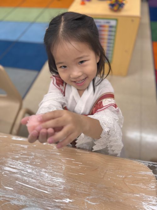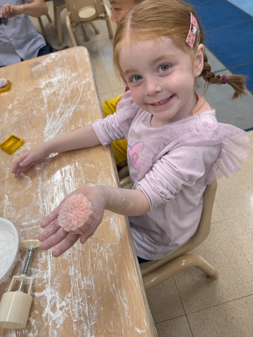 After the storytelling session, the most anticipated moment arrived—making mooncakes! Under the careful instruction of their teachers, each child learned how to fill, press, and mold the dough. Beaming with pride, they displayed their pink mooncakes, each imprinted with unique designs, reflecting their creativity and hard work.