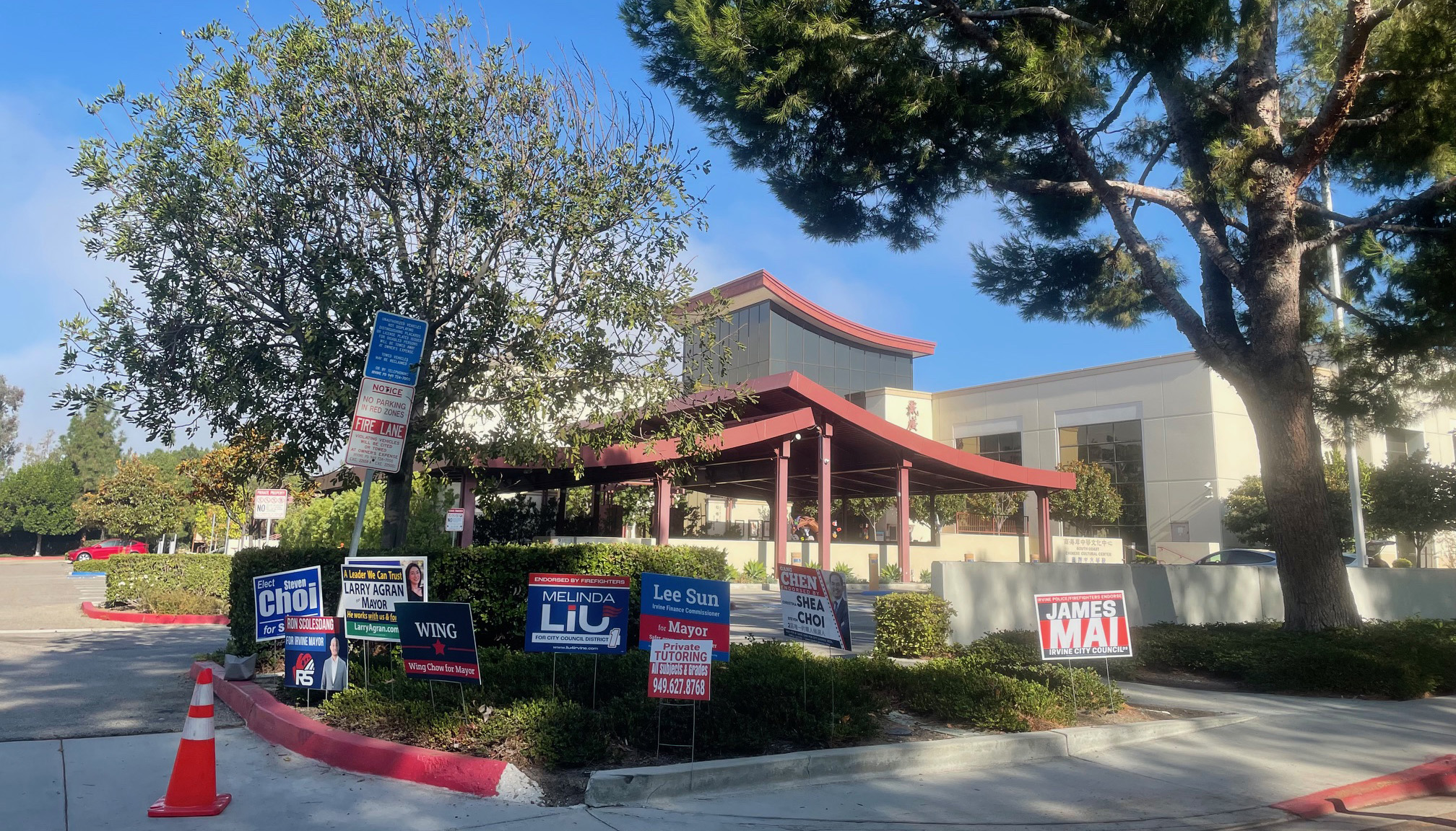 The South Coast Chinese Cultural Center, known for its promotion of Chinese language education and cultural arts courses, has become a bustling hub for campaign activities, with numerous candidate billboards filling the area outside its entrance.