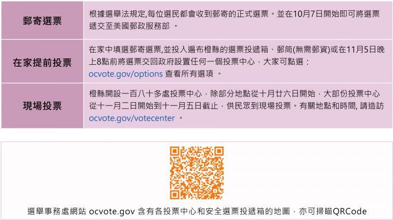 現場投票: 橙縣開設一百八十多處投票中心,除部分地點從10月26日開始,大部份投票中心從11月2日開始到11月5日截止,供民眾到現場投票。有關地點和時間, 請造訪 ocvote.gov/votecenter。