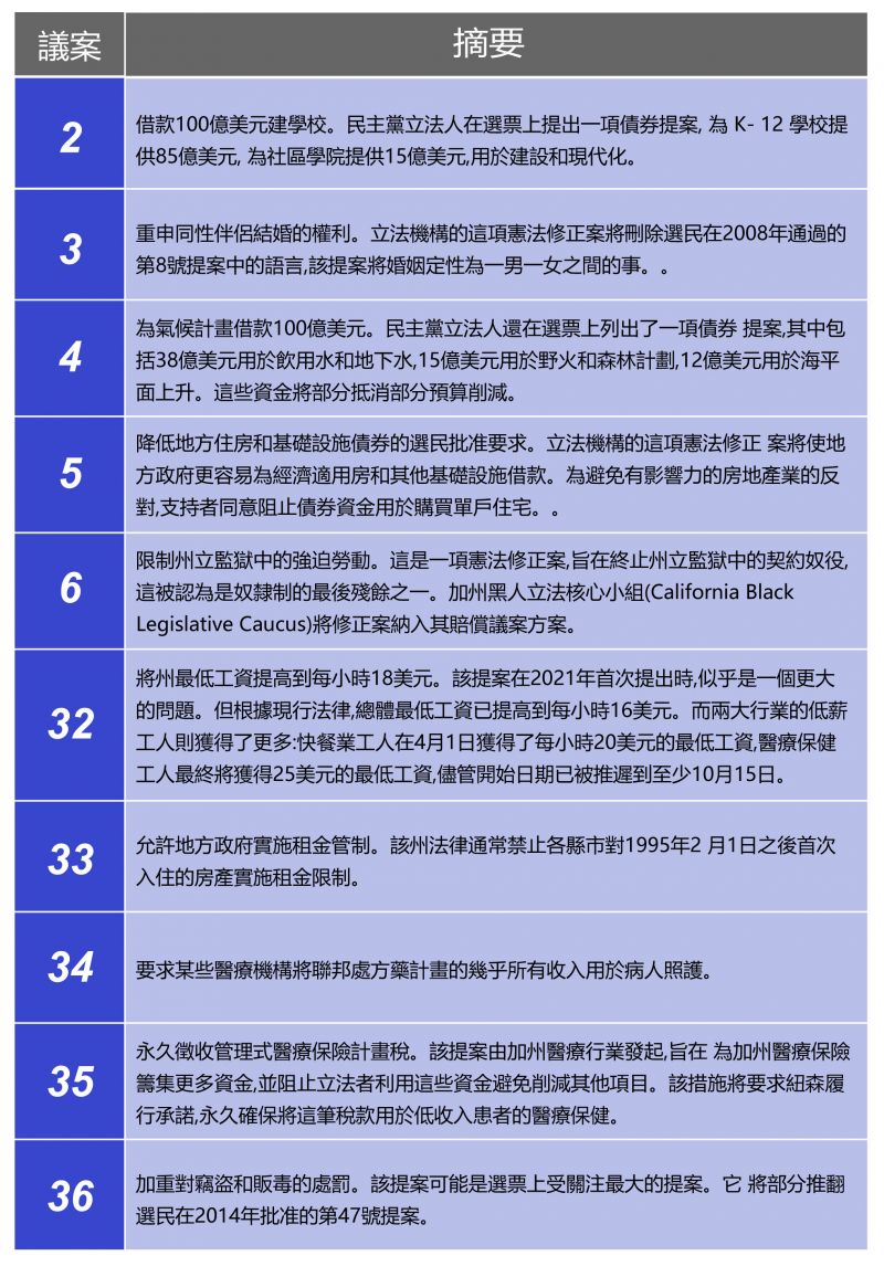 加州10項提案,列表如下 :