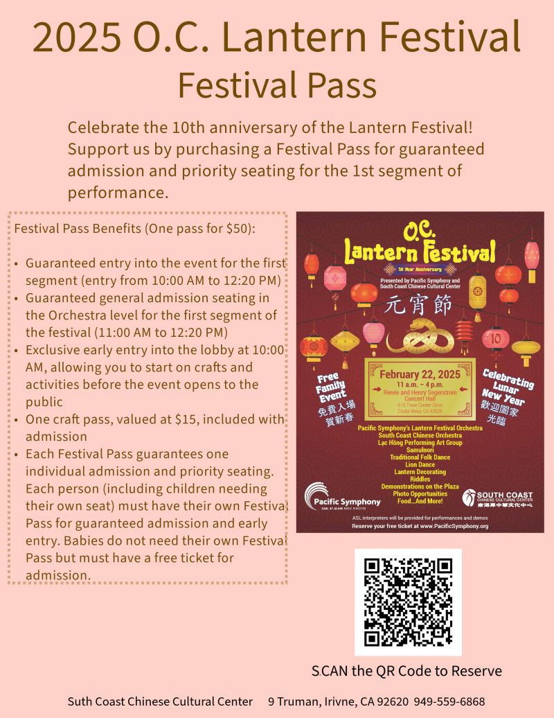 To celebrate the Lantern Festival, the South Coast Chinese Cultural Center, in collaboration with the Pacific Symphony, will host the 10th annual Lantern Festival event. We need your support to keep this event free and accessible to the public.