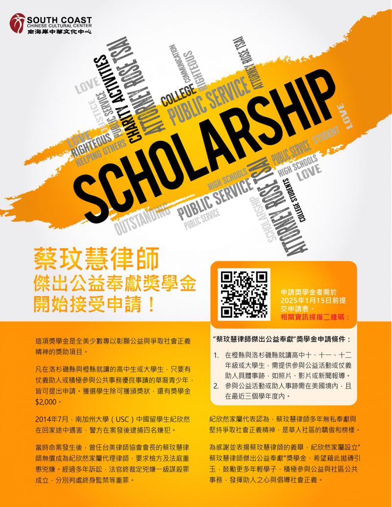 The application deadline for the "Attorney Rose Tsai Outstanding Public Service" scholarship is January 15. Don’t miss your last chance to apply!