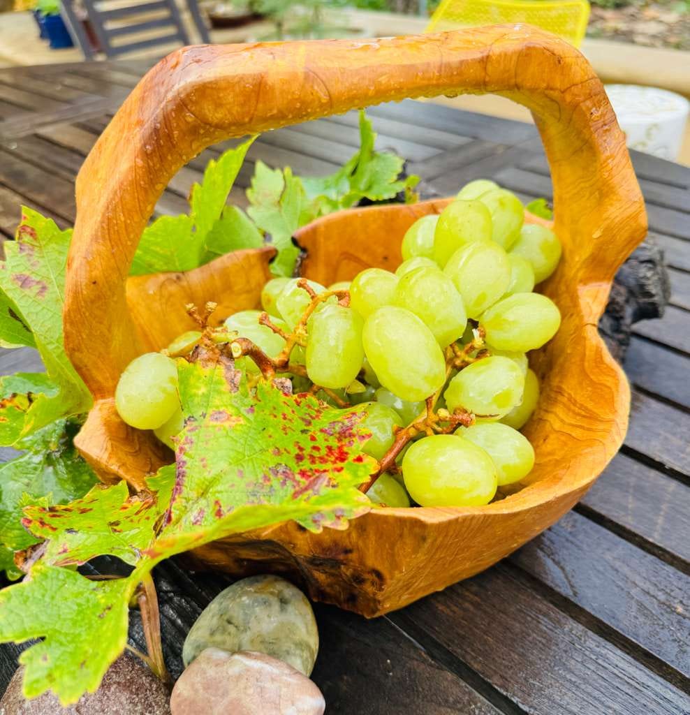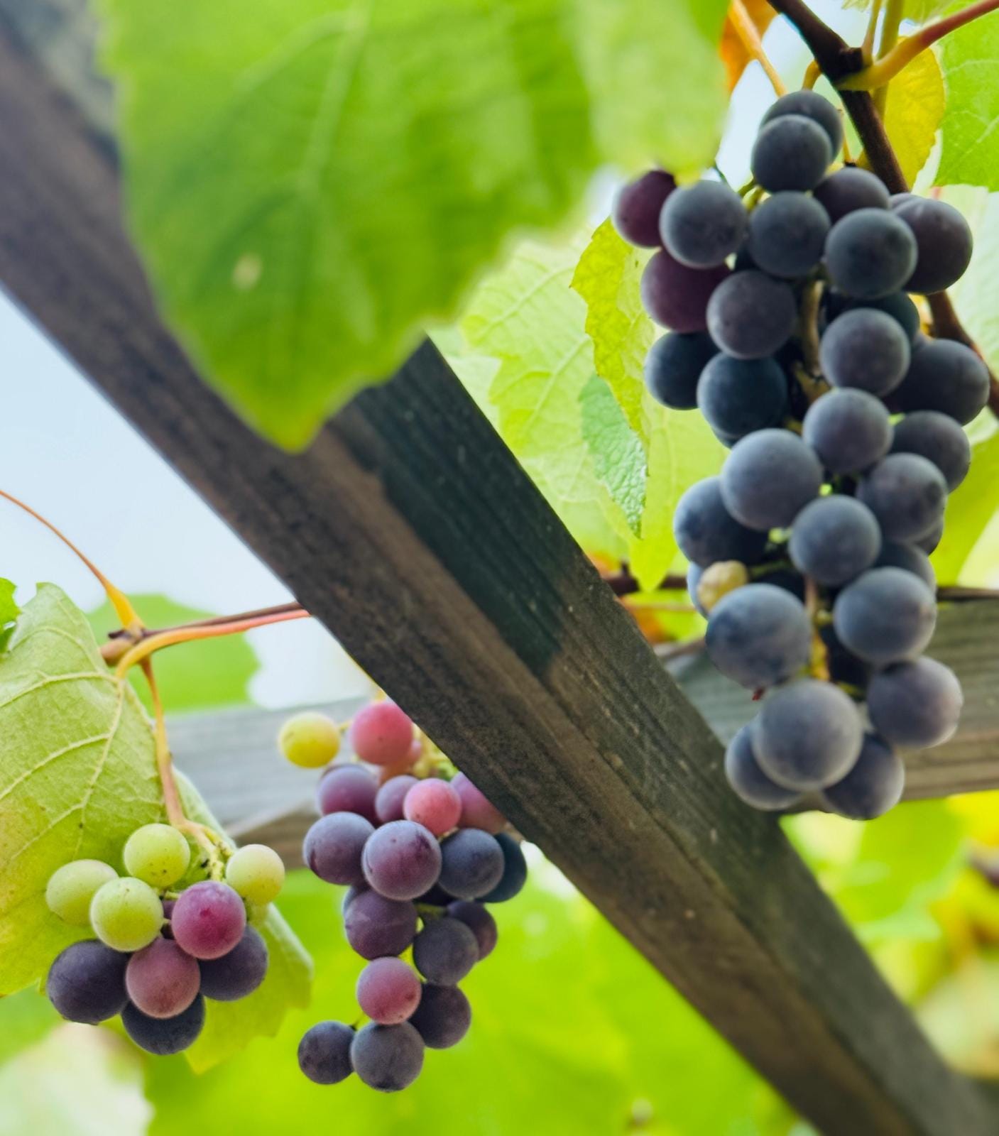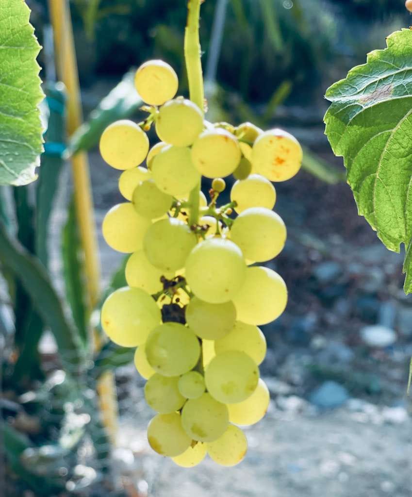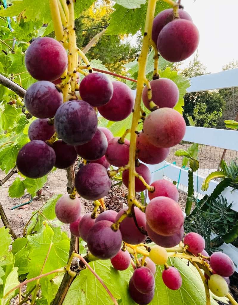 我們家園裡栽種的是桌上食用葡萄。平常在超市可以買到的綠、紅、紫、黑葡萄,像是Cotton Candy,Crimson,Autumn Royal⋯,我們不種,只種那時較難買到的巨峰紫葡萄,忘了綠葡萄的品種,也許是普通一般,不過顆粒飽滿紮實,晶瑩剔透,風味清爽可口,甜又多汁,就當作是”秋翠”葡萄吧。十多年來,這六株葡萄從搭設支架讓它們攀爬,日常施肥、灌溉、修枝、篩選、疏果,至今年年結果纍纍。入冬後進入休眠期,鬆土讓土壤透氣,剪去頂芽側枝。隔年三、四月開始發新芽,初夏開乳白色的兩性花,自花授粉,結成漿果。慢慢地成長,靜靜地熟透,一粒粒小圓珠裡包裹著整個夏日時光。